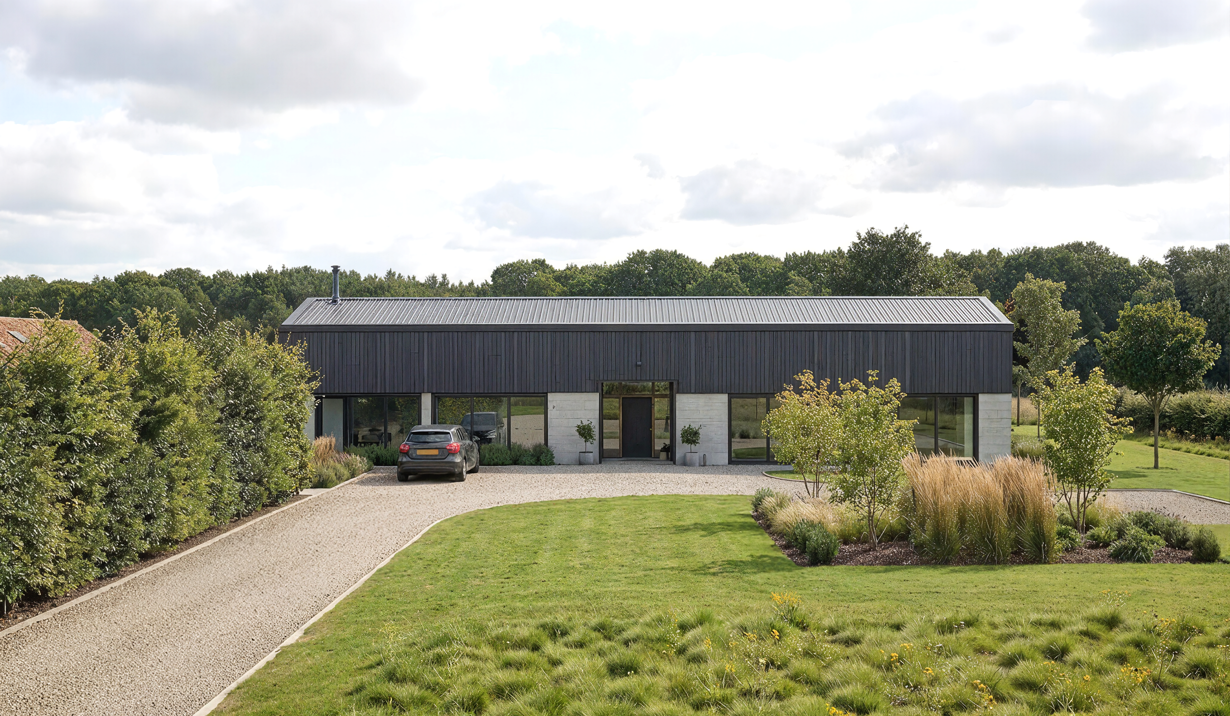 Materiality: A restrained palette of natural timber, exposed steelwork and engineered concrete creates an industrial aesthetic balanced with rural warmth. High-performance glazing and discreet insulation measures ensure comfort and efficiency without compromising the building’s character.